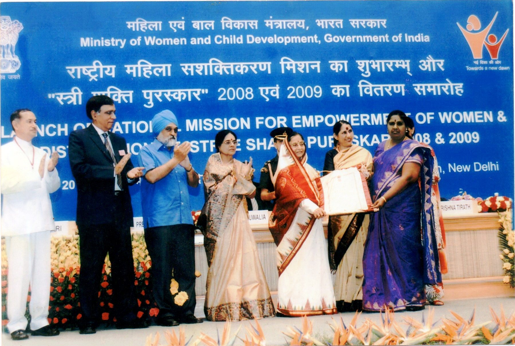 Conferred by the Hon’ble President of India at Vigyan Bhavan, New Delhi on 8th March 2010 — this prestigious National Award honors exceptional contributions towards the socio-economic development of women. - Kittur Rani Chennamma State Award